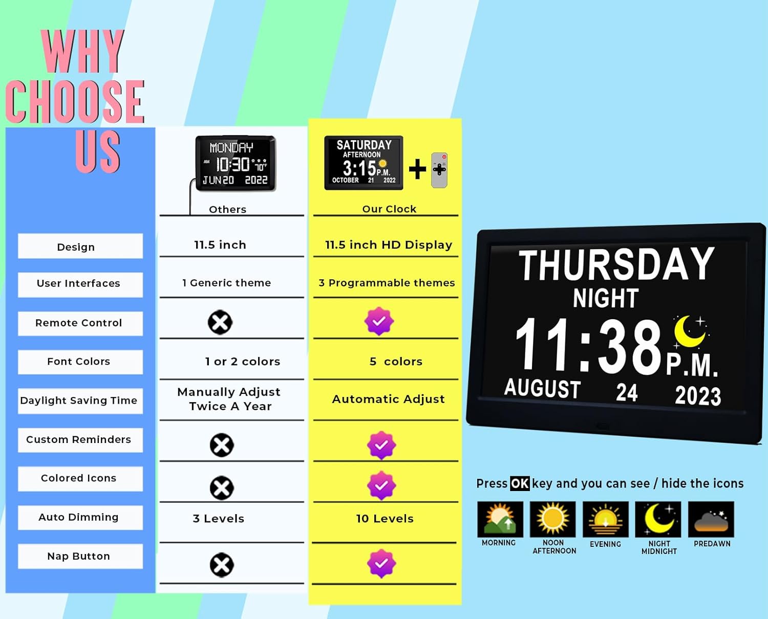 Diese große digitale Tagesuhr verfügt über ein leicht ablesbares 11,5-Zoll-Display, das ideal für ältere Benutzer, Demenzkranke oder Personen mit Sehbehinderung ist. Mit 19 programmierbaren Erinnerungen hilft sie dabei, tägliche Routinen wie Medikamente, Mahlzeiten oder Termine zu verwalten. Die Uhr zeigt die Uhrzeit, das Datum und den Wochentag in großen, fetten Buchstaben an, reduziert Verwirrung und unterstützt die Unabhängigkeit. Mehrere Varianten, einschließlich Standard-, 8808- und RGB-Versionen, ermöglichen es Ihnen, den Stil auszuwählen, der Ihren Bedürfnissen entspricht. Erhältlich in Schwarz oder Weiß fügt sie sich in jedes Zuhause, Kinderzimmer oder Pflegeumfeld ein.