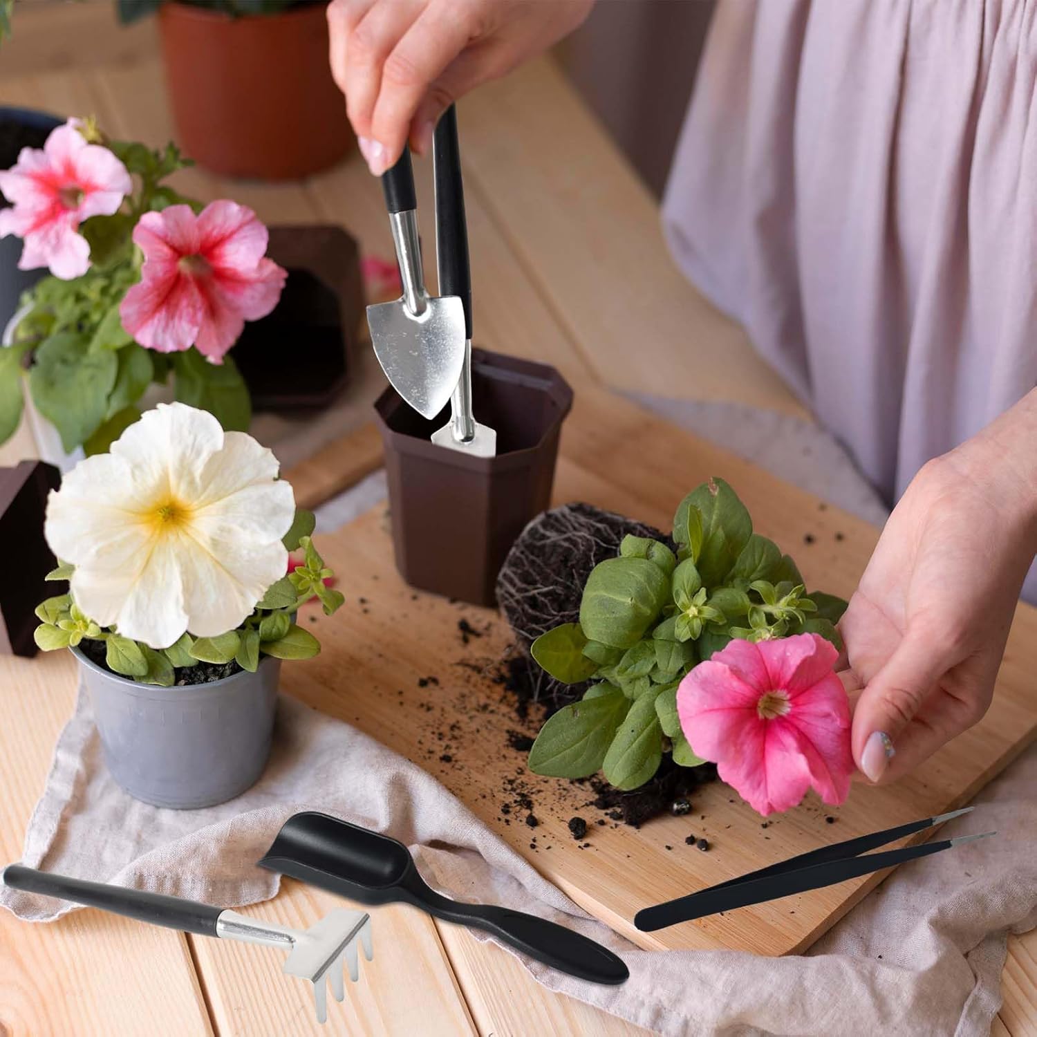 Dieses 12-teilige Sukkulenten-Pflege-Kit umfasst Scheren, Schaufeln, Rechen, einen Lochstanzer, einen Löffel, eine Pinzette und eine Leinen-Aufbew Tasche. Es wurde für Umtopfen, Beschneiden und Unkrautjäten entwickelt und ist mit nur 165 g leicht und kompakt. Edelstahl-Werkzeugköpfe und die wiederverwendbare Aufbewahrungstasche sorgen dafür, dass alles organisiert bleibt, perfekt für die Pflege von Zimmerpflanzen oder als Geschenk.